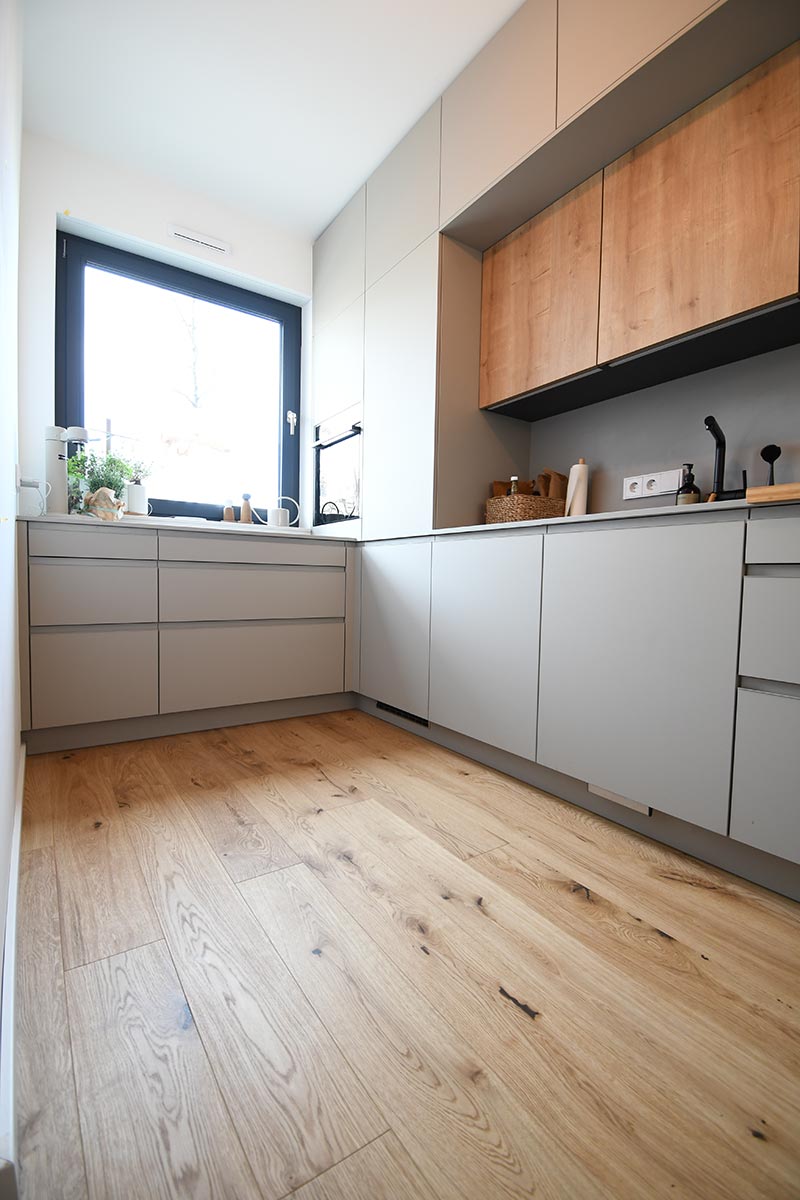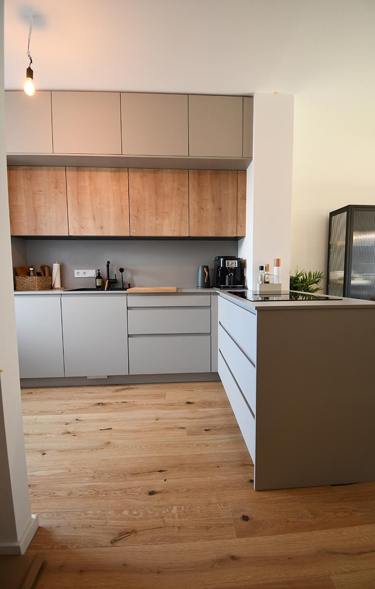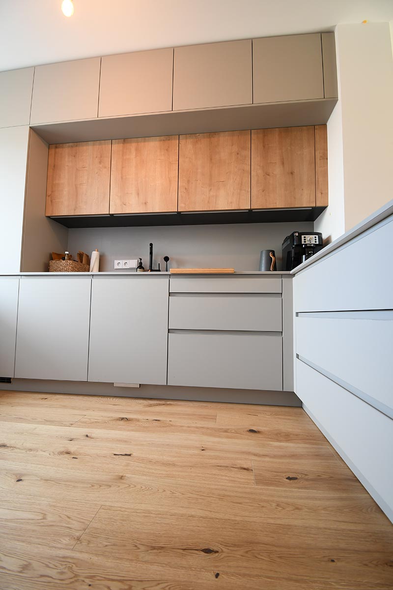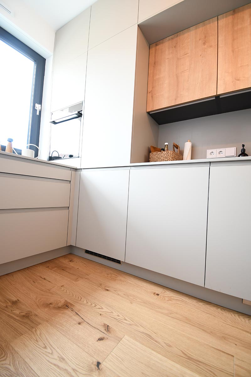 Die Optik dieser offenen Küche in Dekor Eiche und Uni-Dekor zeichnet sich durch Details wie z.B. die grifflose Fronten aus. Herd wurde hochgesetzt und verfügt über eine versenkbarer Türe.