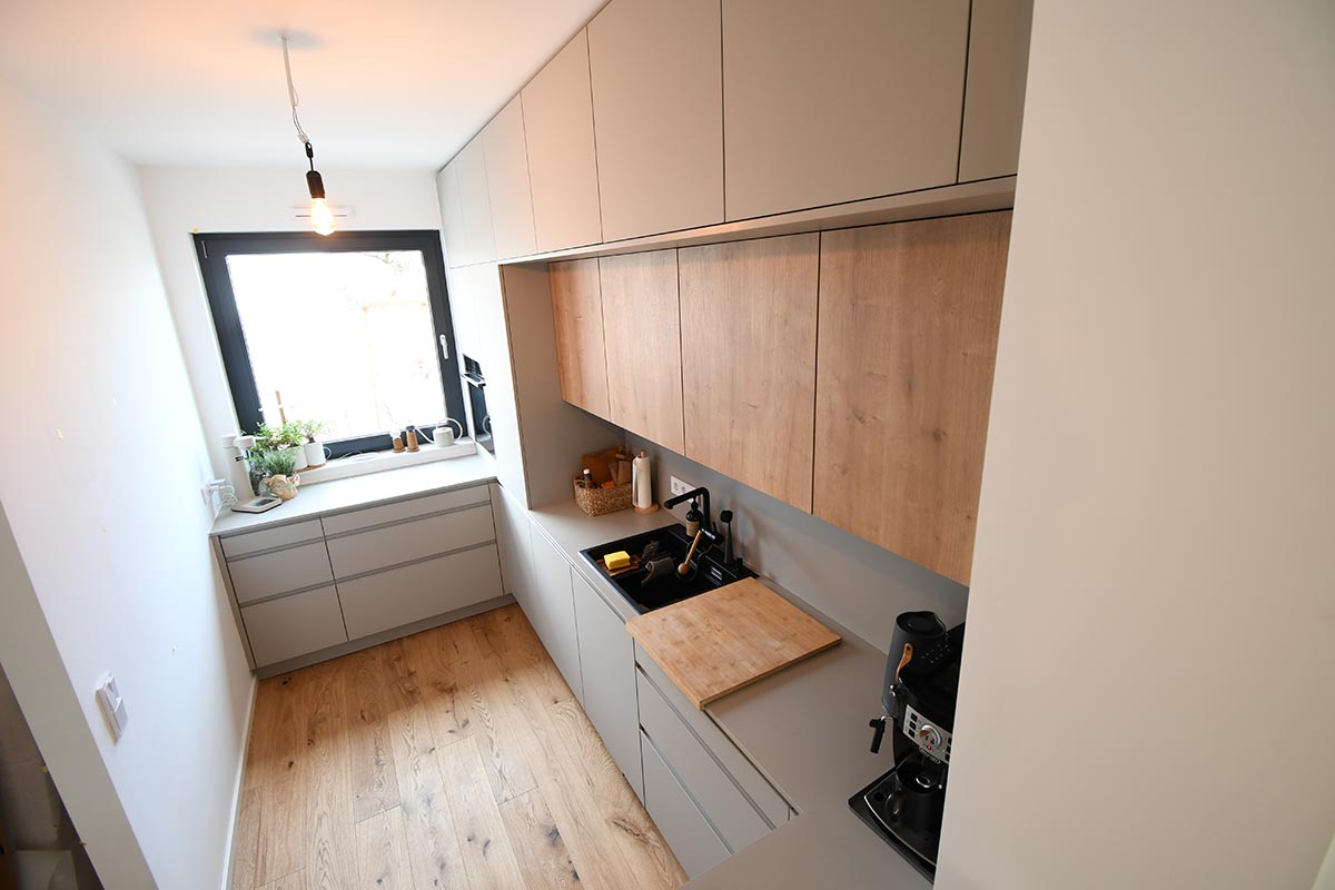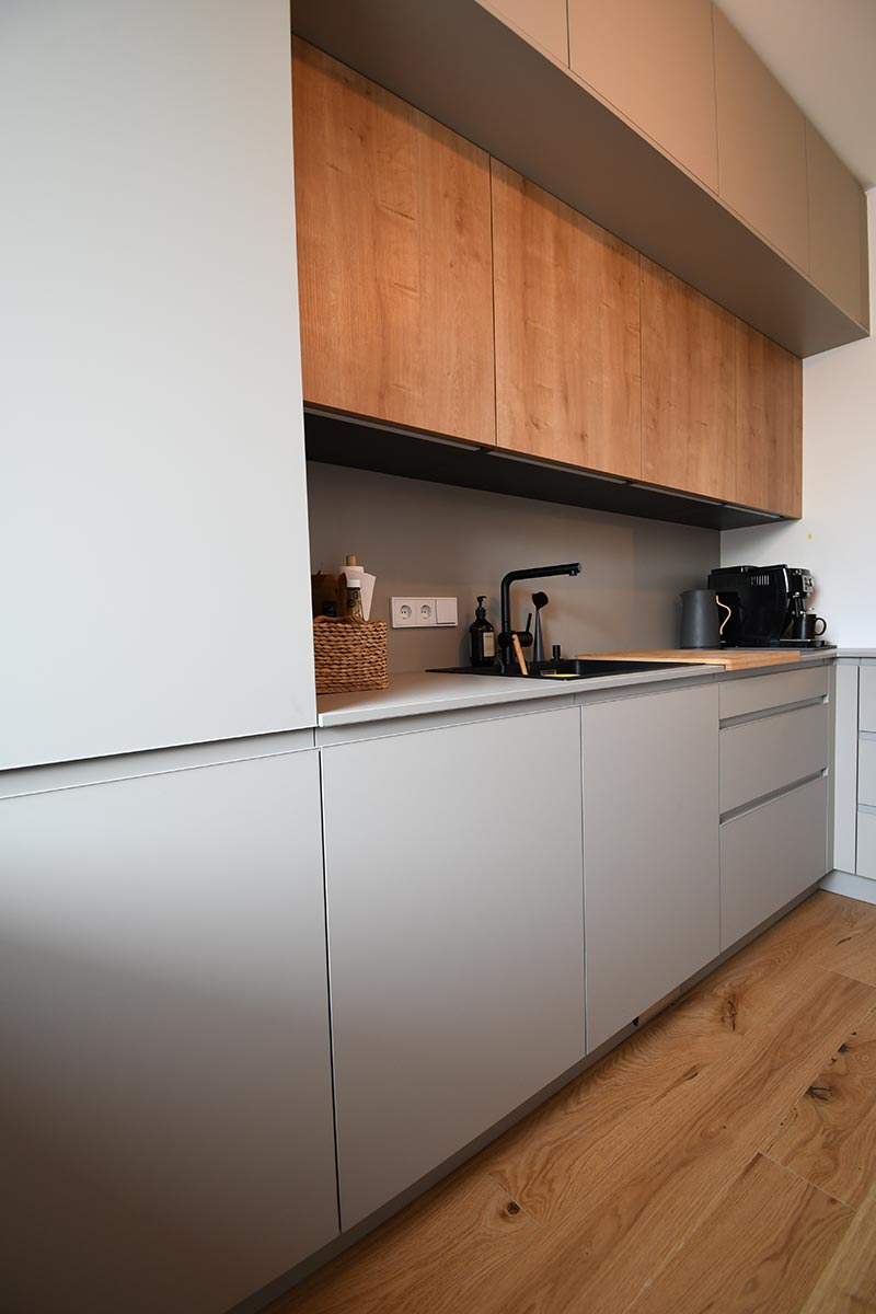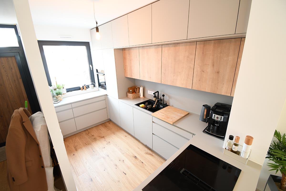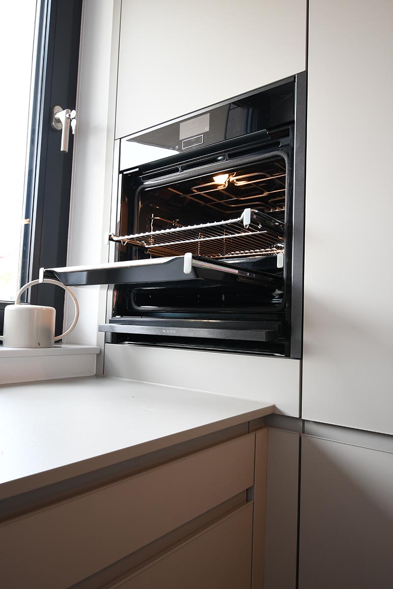 Die Optik dieser offenen Küche in Dekor Eiche und Uni-Dekor zeichnet sich durch Details wie z.B. die grifflose Fronten aus. Herd wurde hochgesetzt und verfügt über eine versenkbarer Türe.