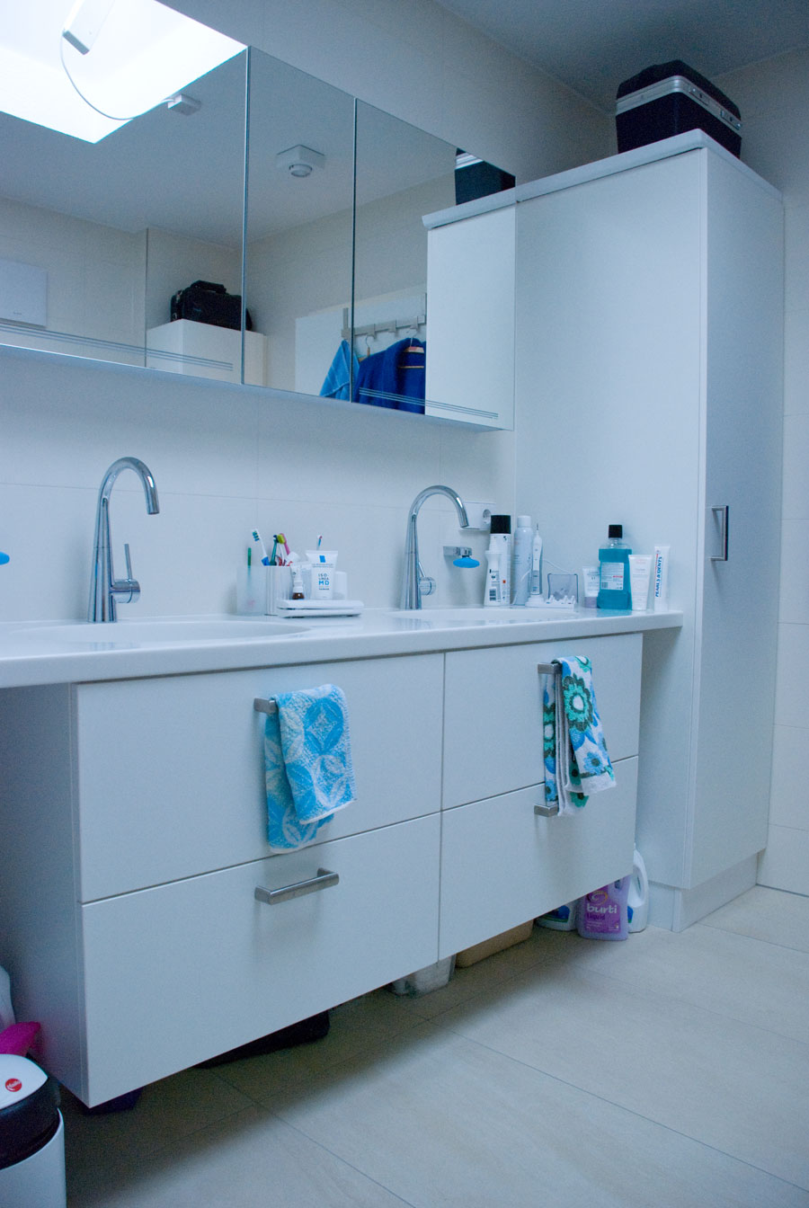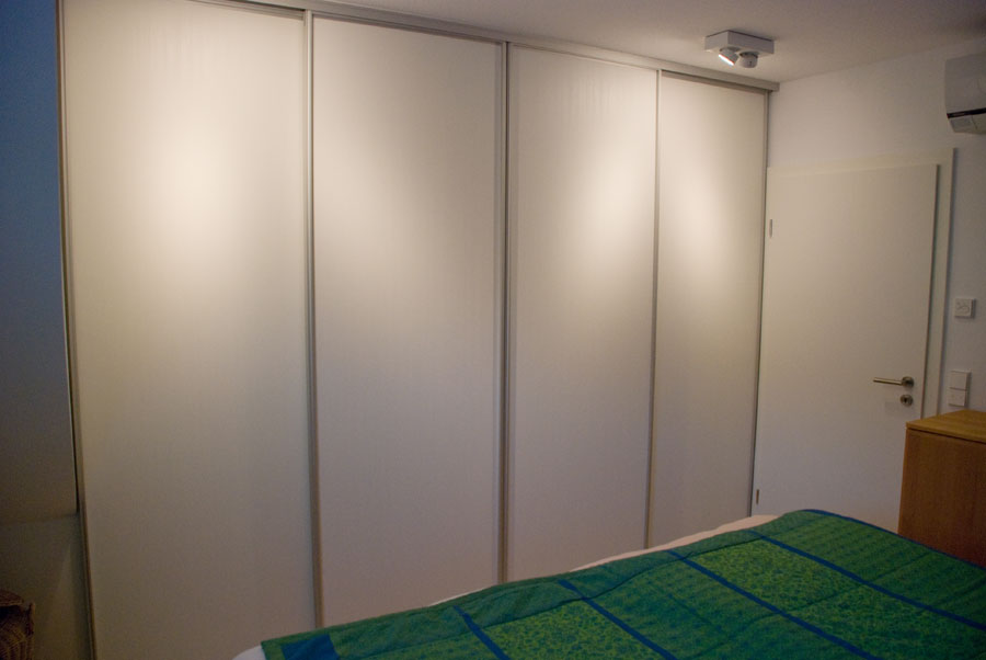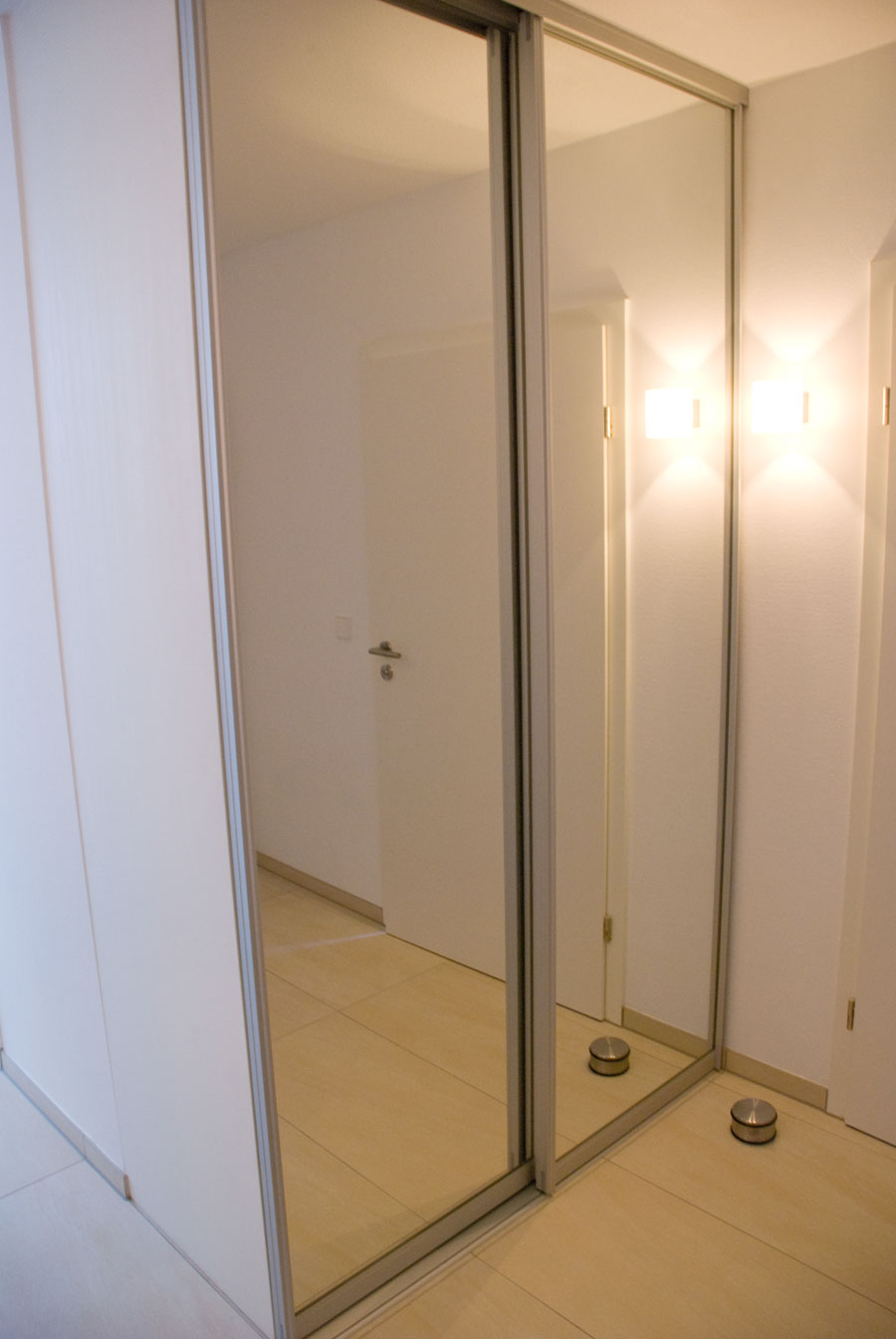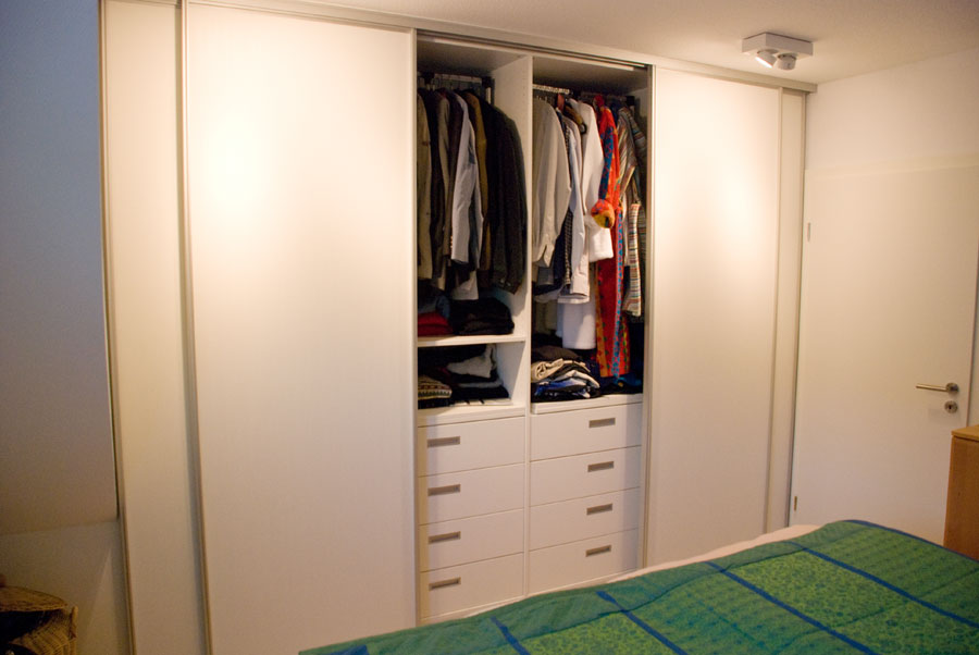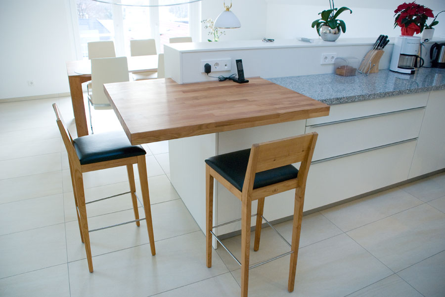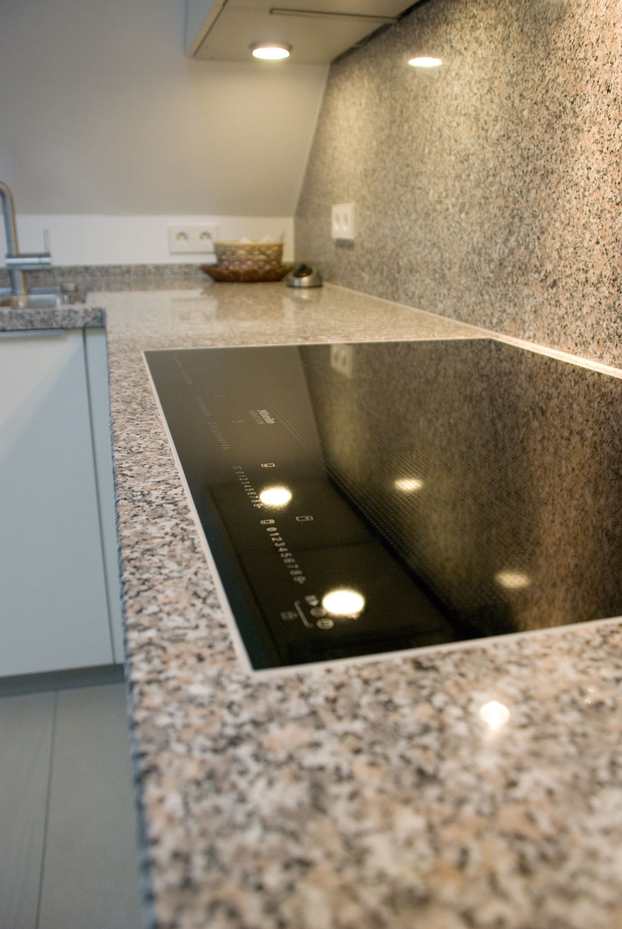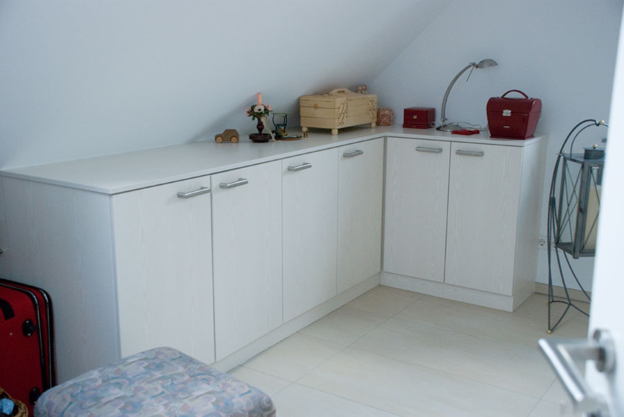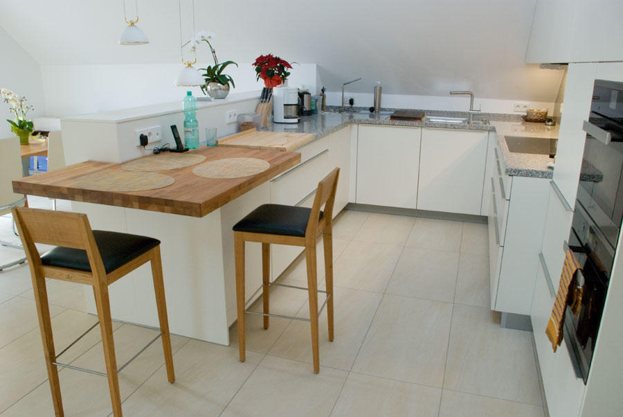 Offene Einbauküche bis unter die Dachschräge komplett nutzbar. Die Oberfläche wurde lackiert, Stehtisch Buche natur geölt, die Arbeitsplatte besteht aus Granit, das Kochfeld und die Spüle sind flächenbündig. Mehrere Einbauschränke mit Gleittüren in der Gardeorbe und im Schlafzimmern, das Sideboard läuft über Eck und unter der Dachschräge - im Dekor passend zu den Schiebetüren und Schränken.