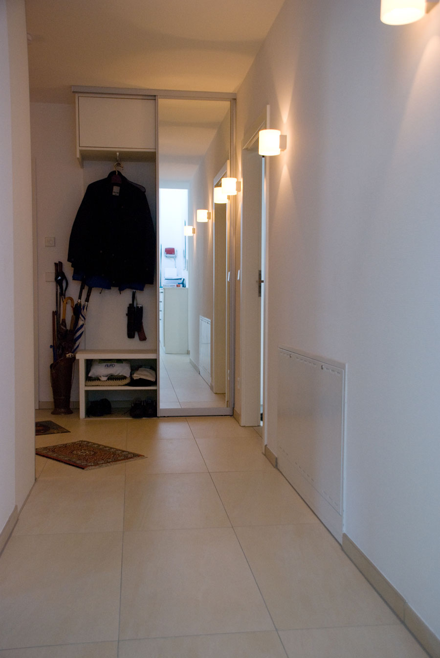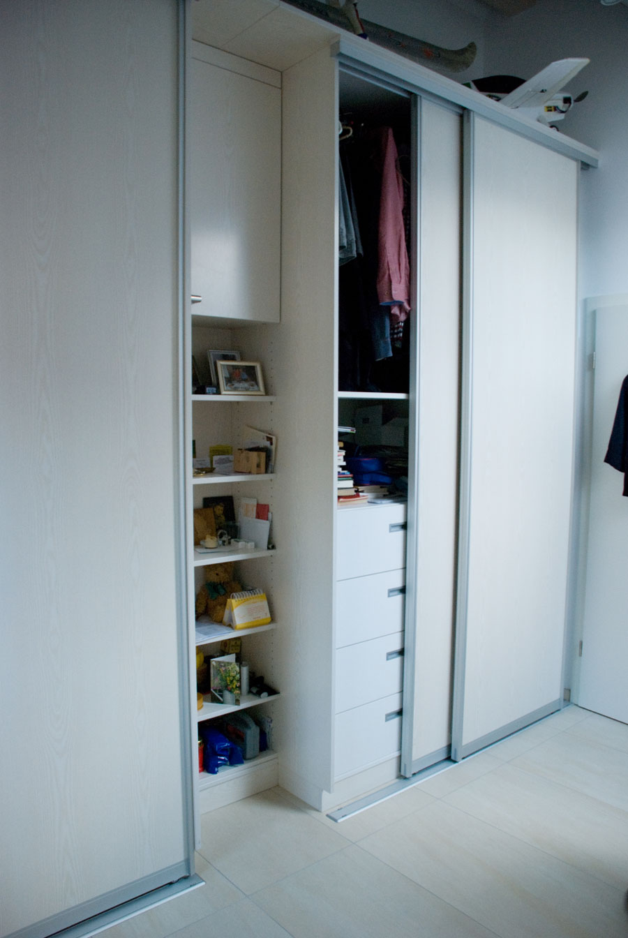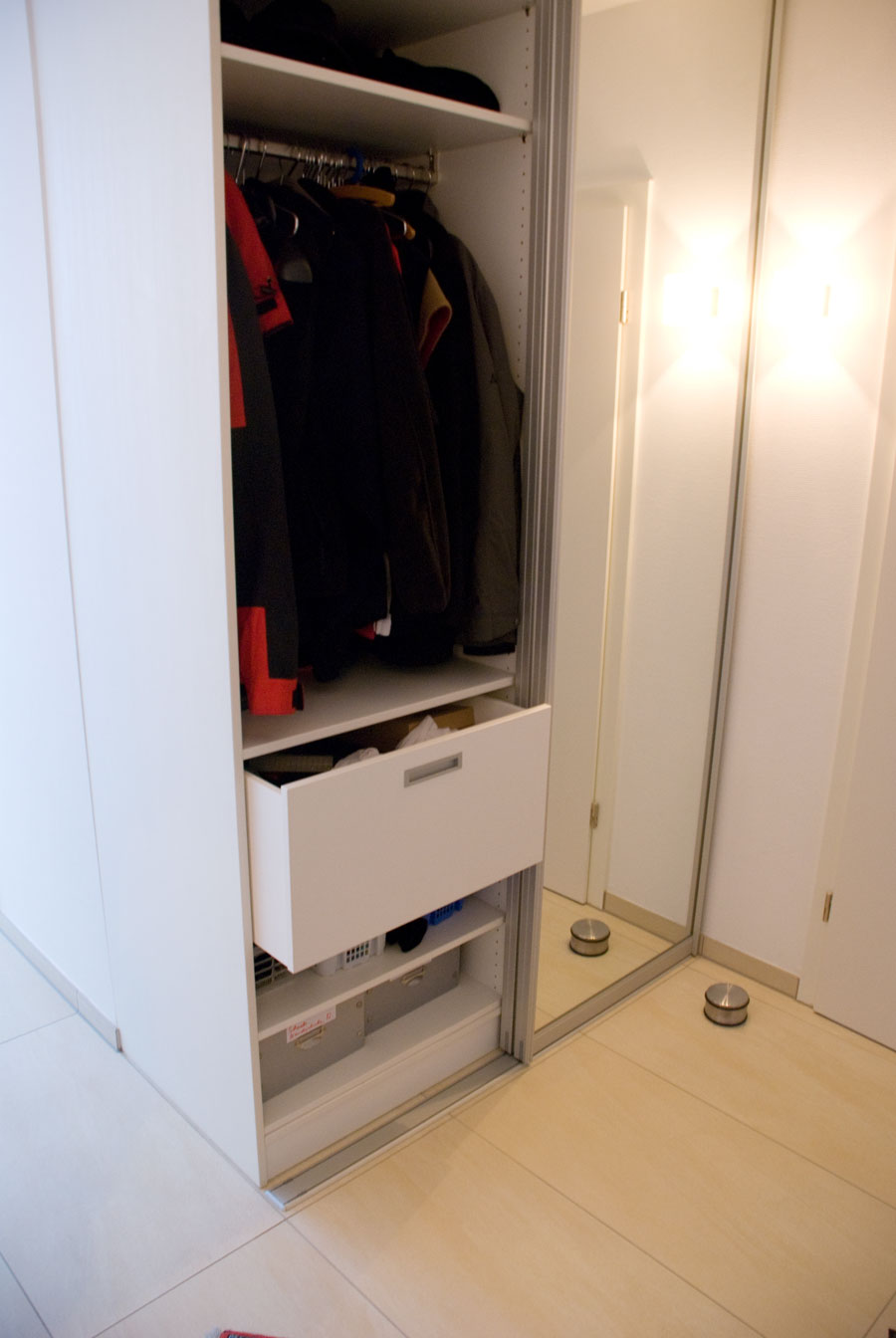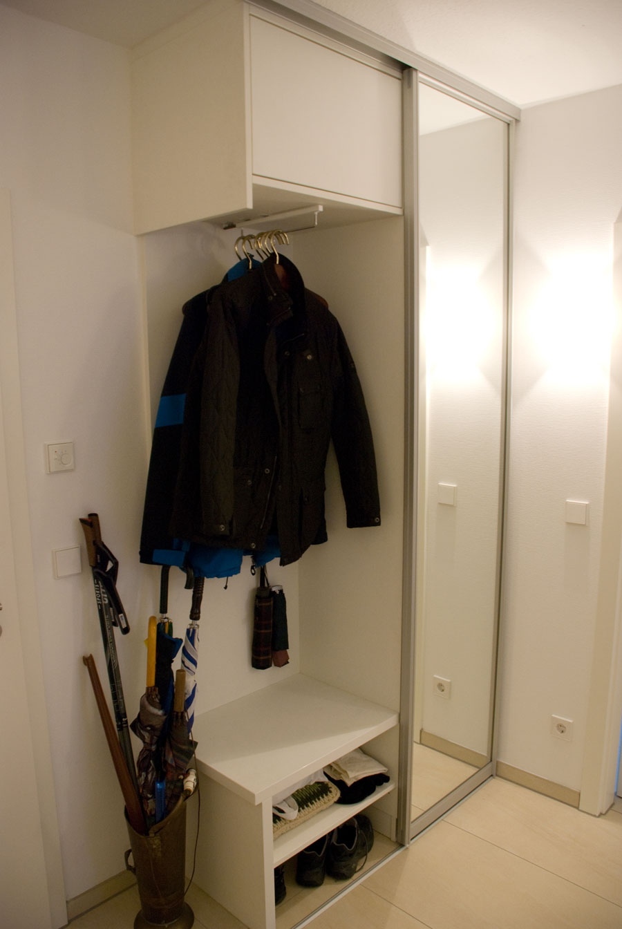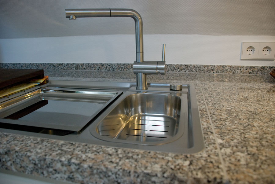 Offene Einbauküche bis unter die Dachschräge komplett nutzbar. Die Oberfläche wurde lackiert, Stehtisch Buche natur geölt, die Arbeitsplatte besteht aus Granit, das Kochfeld und die Spüle sind flächenbündig. Mehrere Einbauschränke mit Gleittüren in der Gardeorbe und im Schlafzimmern, das Sideboard läuft über Eck und unter der Dachschräge - im Dekor passend zu den Schiebetüren und Schränken.