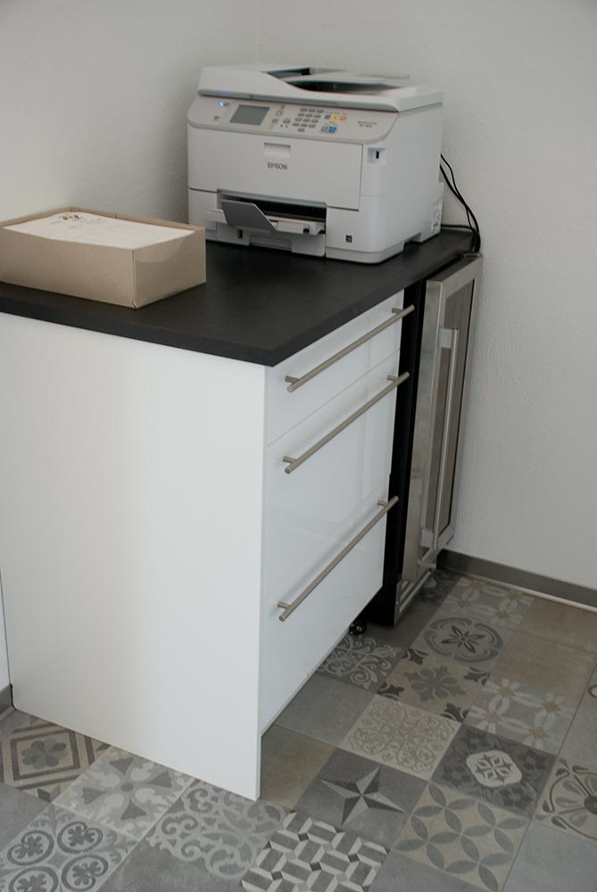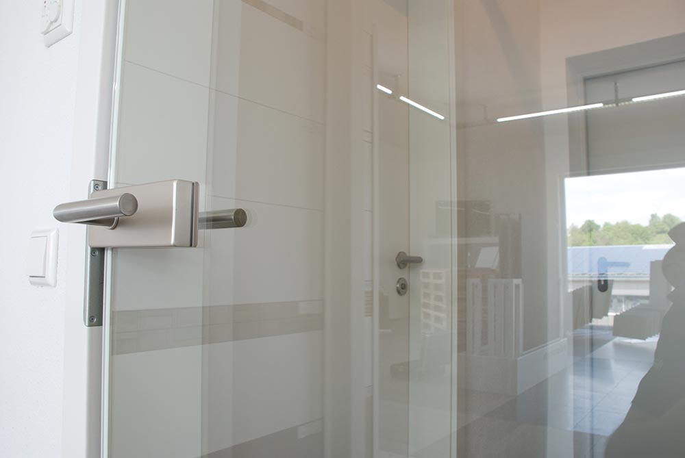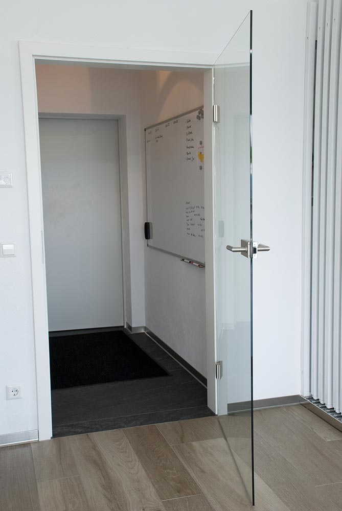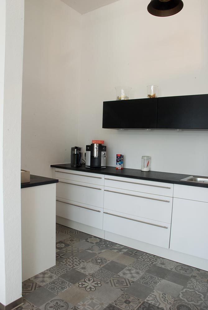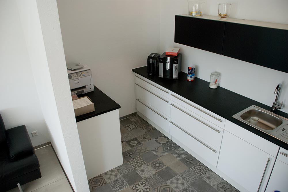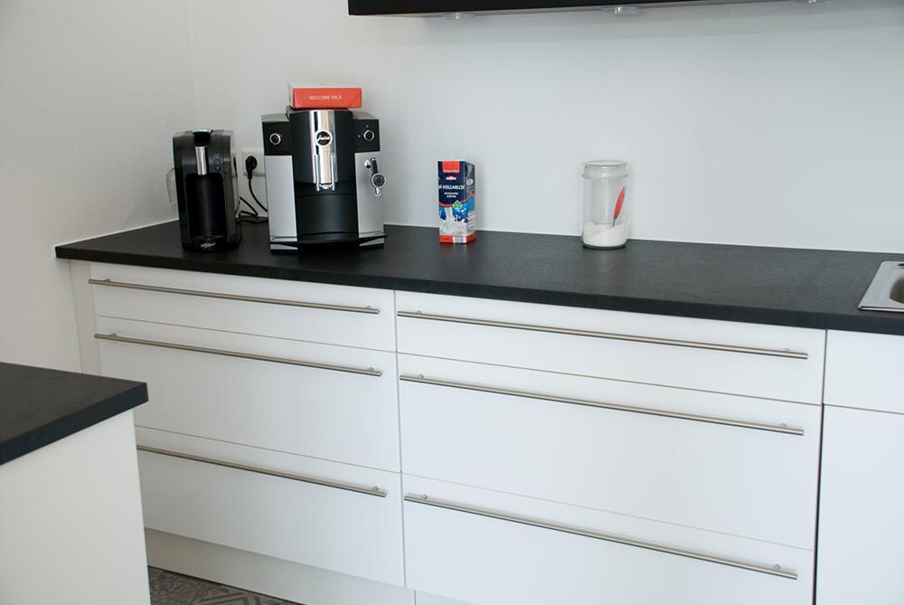 Die Teeküche wurde in einem Ausstellungsraum installiert. Der Ausstellungsraum wurde zusätzlich mit Türen aus unserer Schreinerei ausgestattet.