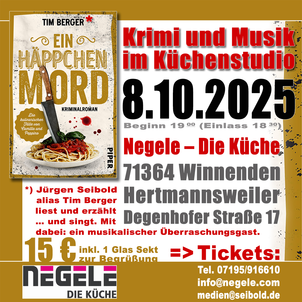 Wir laden euch ein zur Krimi Lesung: Jürgen Seibold alias Tim Berger liest "Ein Häppchen Mord", erzählt und singt. Mit dabei: ein musikalischer Überraschungsgast.